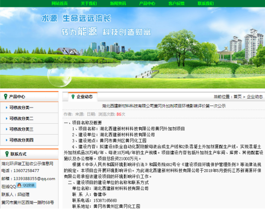 湖北西建新材料科技有限公司于2019年5月24日委托江苏新清源环保科技有限公司承担“湖北西建新材料科技有限公司黄冈外加剂项目”的环境影响评价工作。湖北西建新材料科技有限公司将有关信息于2019年5月24日在湖北环评竣工验收公示信息网对项目进行了第一次公示。